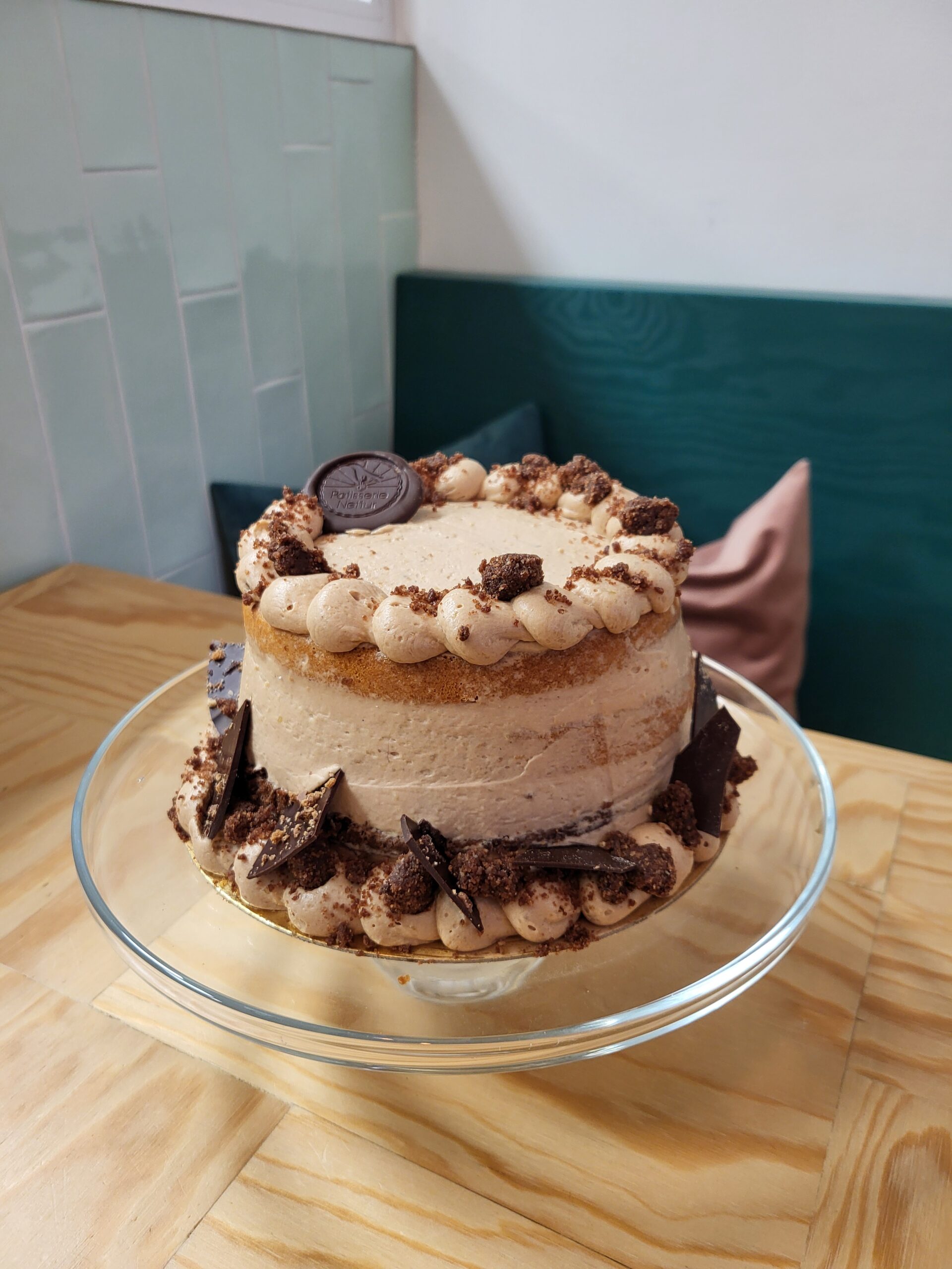 Een luchtig biscuit afgewisseld met een chocolade biscuit, gevuld met Zwitserse room, koffie anglaise en gezouten karamel. Omhuld met een pure chocolade botercrème en pure chocolade scherven.