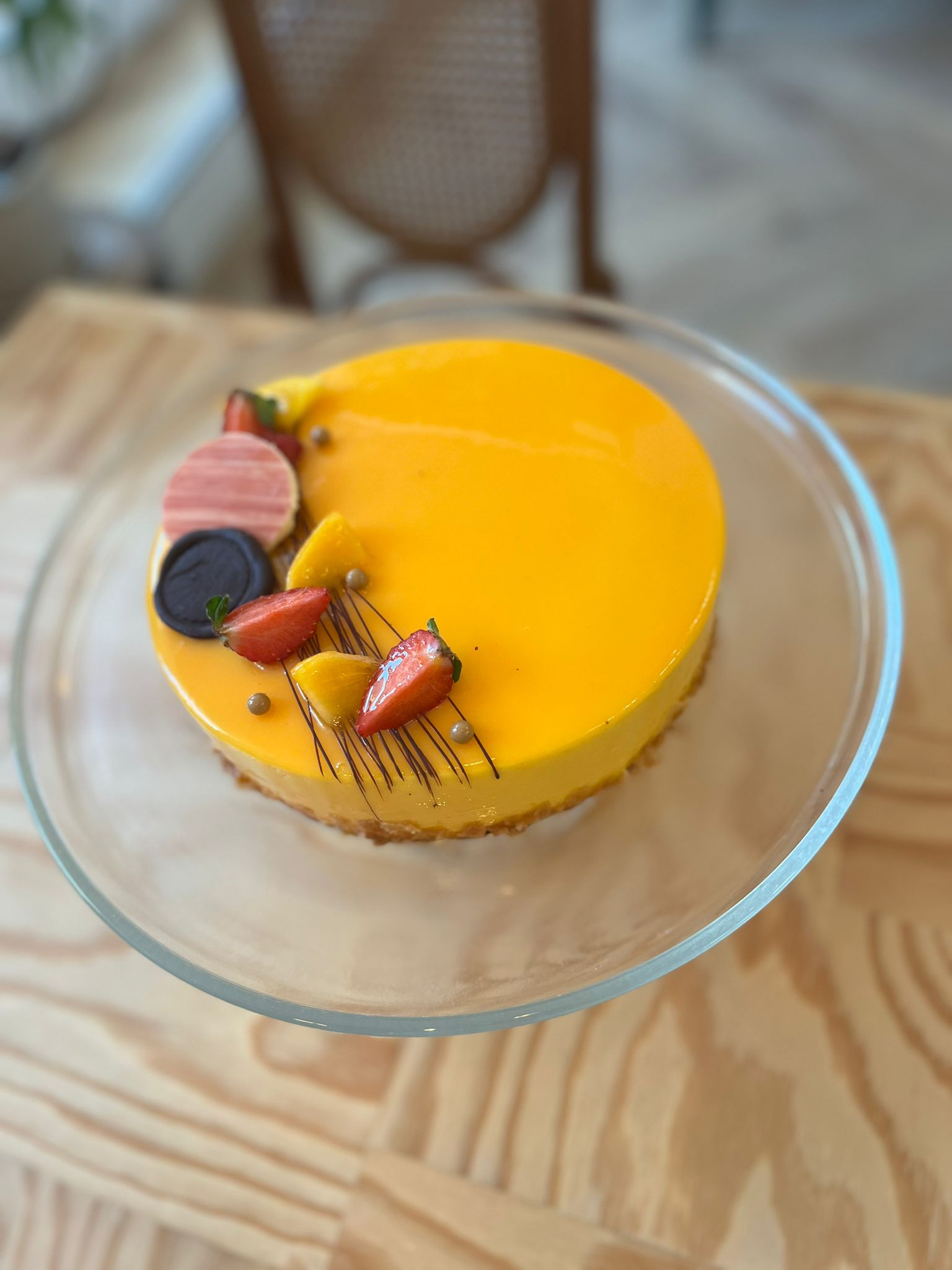 Deze taart is voor 8 personen en is een combinatie van frisse smaken met chocolade. De taart bestaat uit verschillende lagen en texturen; een chocolade crunch bodem, pure chocolade biscuit, gezouten karamel, passievrucht/mango gelei en passievrucht/mango mousse.