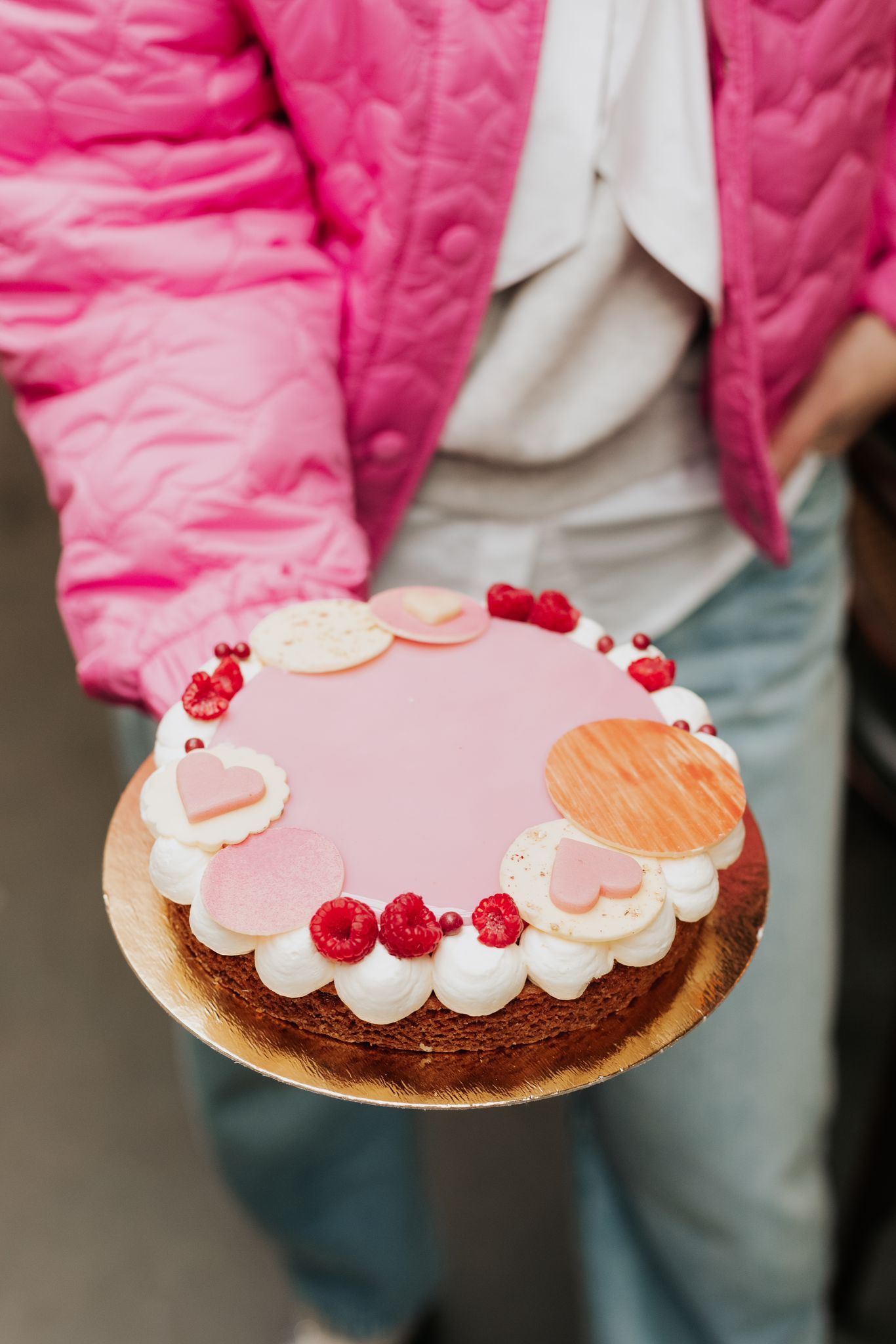 Het moederdagtaartje bestaande uit een stevige sloffenbodem met amandelspijs en banketbakkersroom, dunne laag zure kersen gelei, citroen cremeux en frambozen mousse, aan de zijkant opgepoten met mascarpone vanilleroom. De ’taartversie’ van ons favoriete zomergebakje maar dan met nog net wat extra’s.