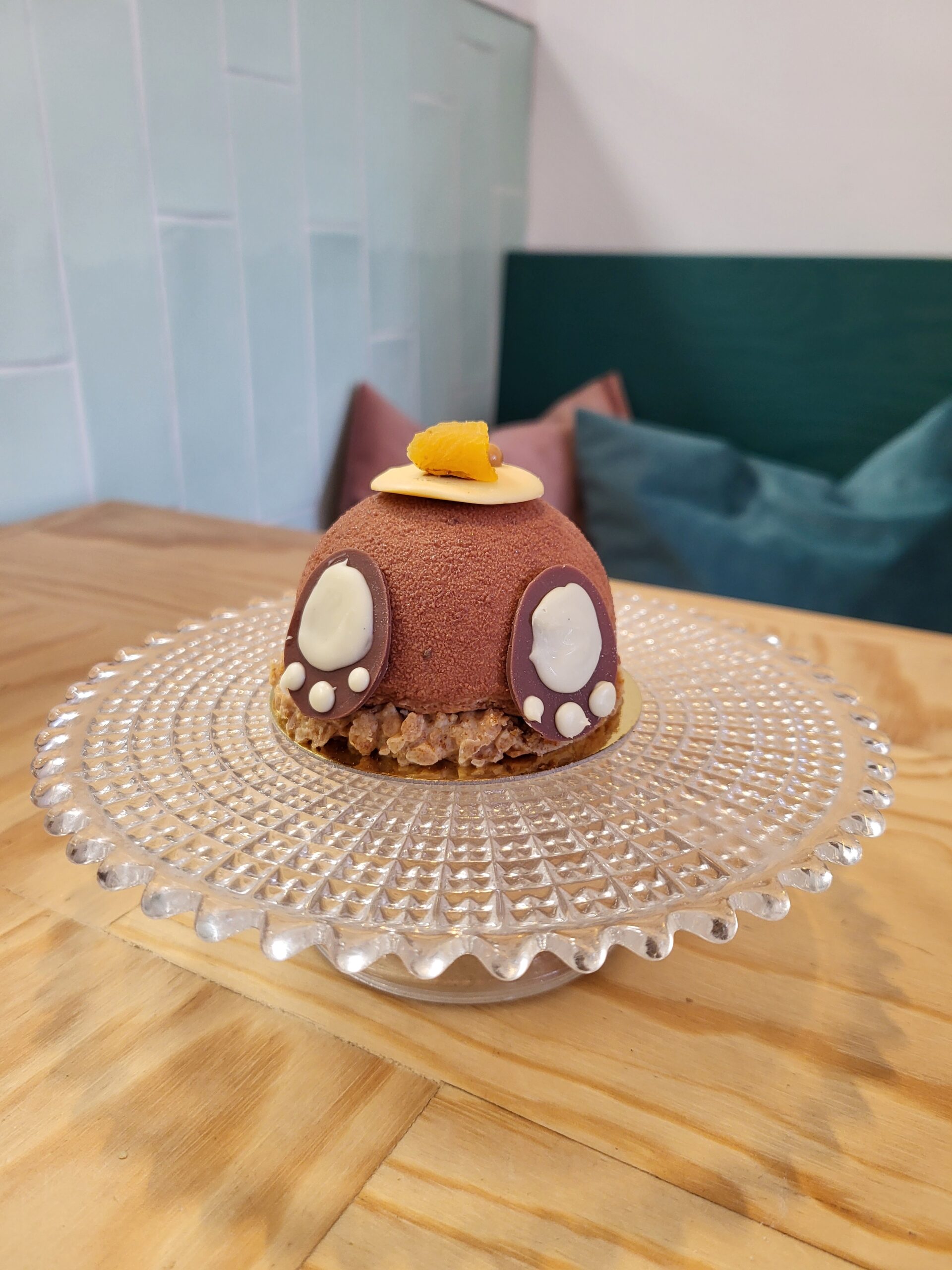 Melkchocolade mousse, kern van melkchocolade hazelnootpraliné cremeux en abrikozen compote, onderop een biscuit en krokante witte chocolade met hazelnootpralinébodem.