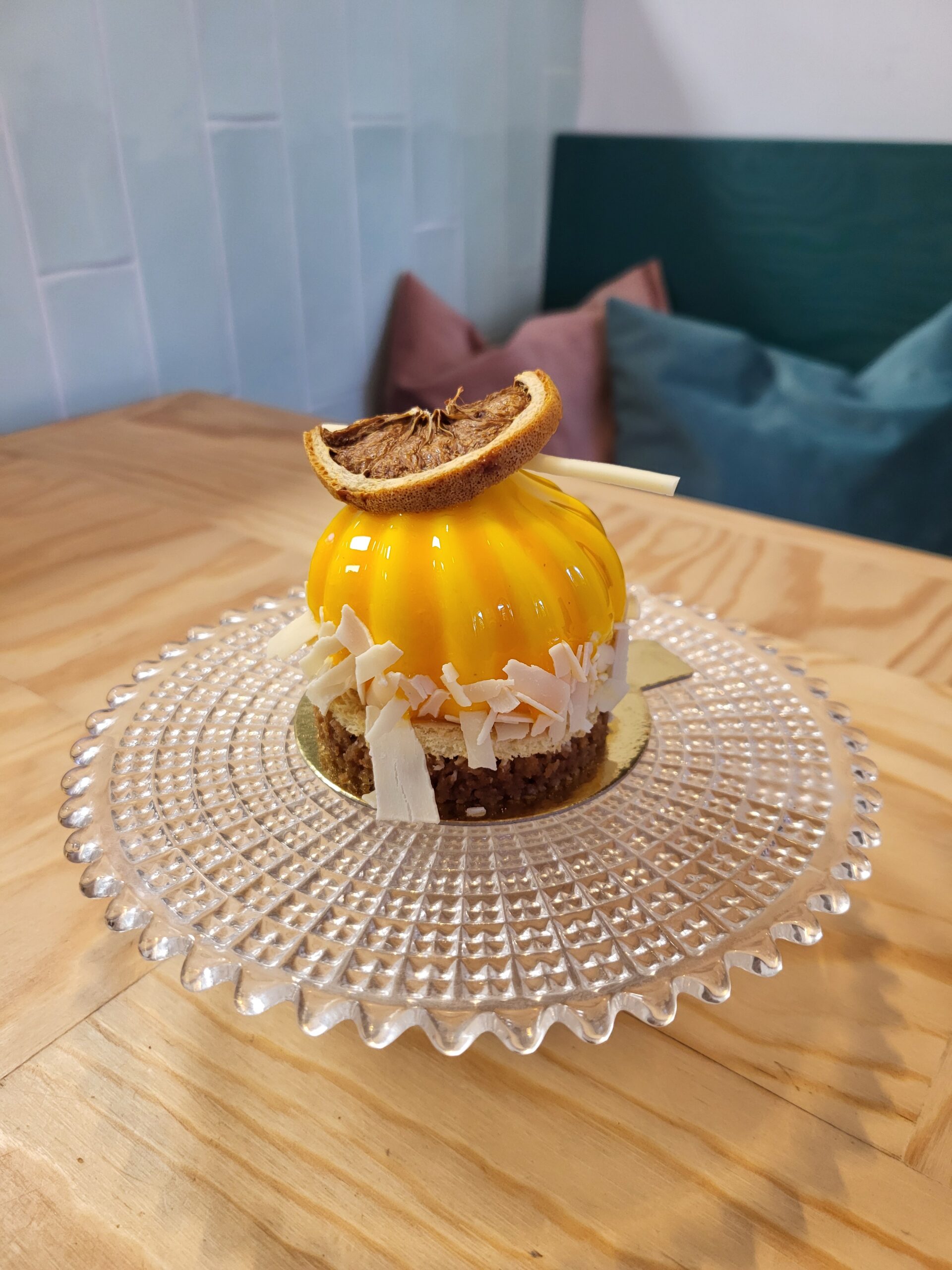 We starten het voorjaar met heerlijke fleurige kleuren en frisse smaken. Een witte chocolade mousse met sinaasappelgelei kern, biscuit en krokante crumble bodem.