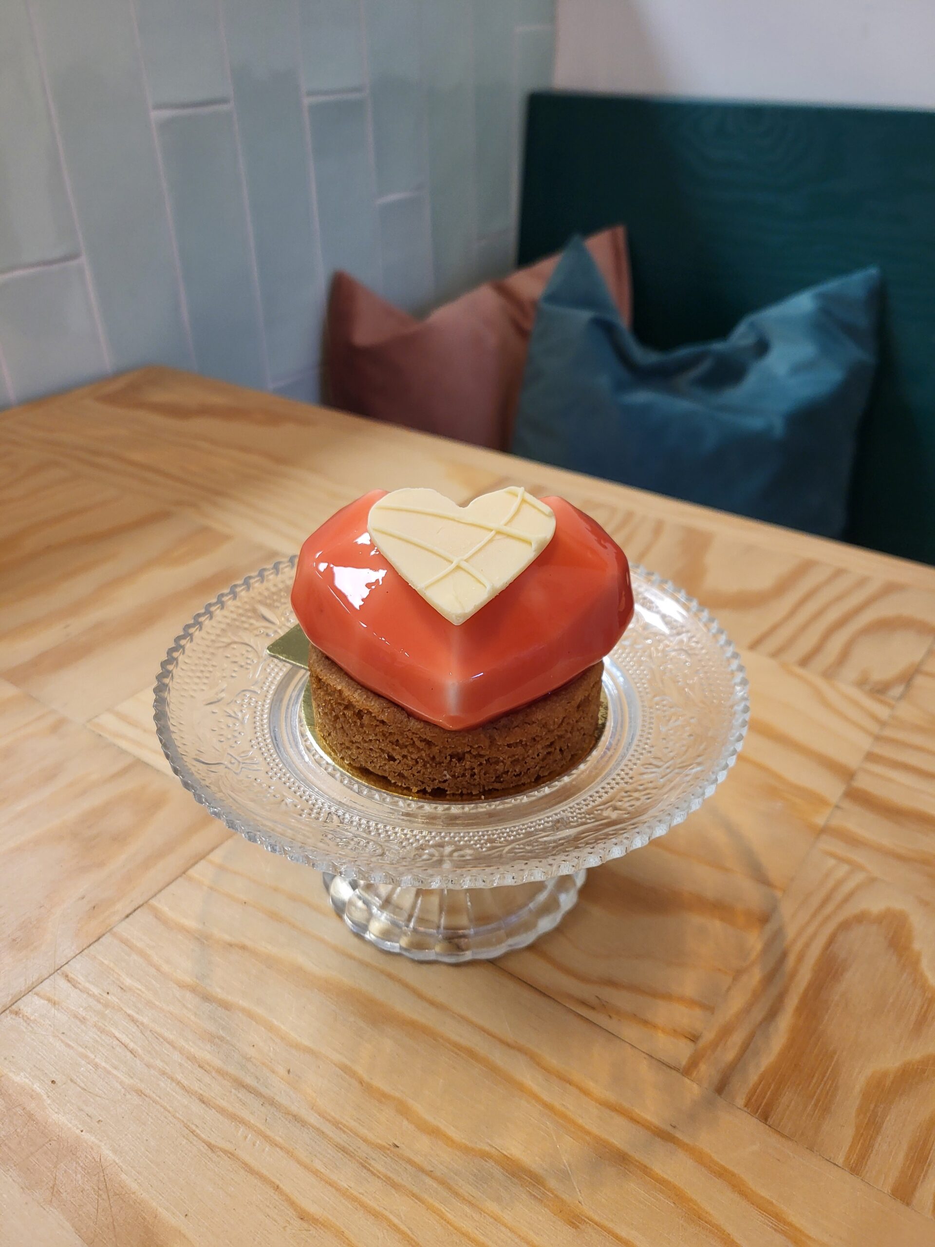 Eenpersoonsgebakje met yoghurt rozenmousse, rabarber compote en frambozen cremeux op een sloffenbodempje.