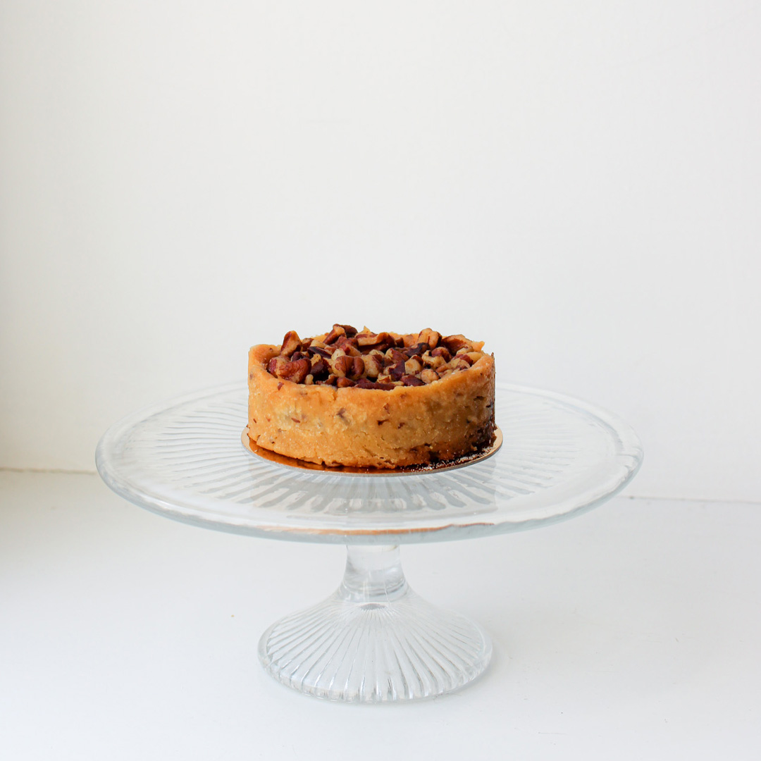 Deze tartelette bestaat uit een krokante koekbodem en is gevuld met pecannoten en karamel.