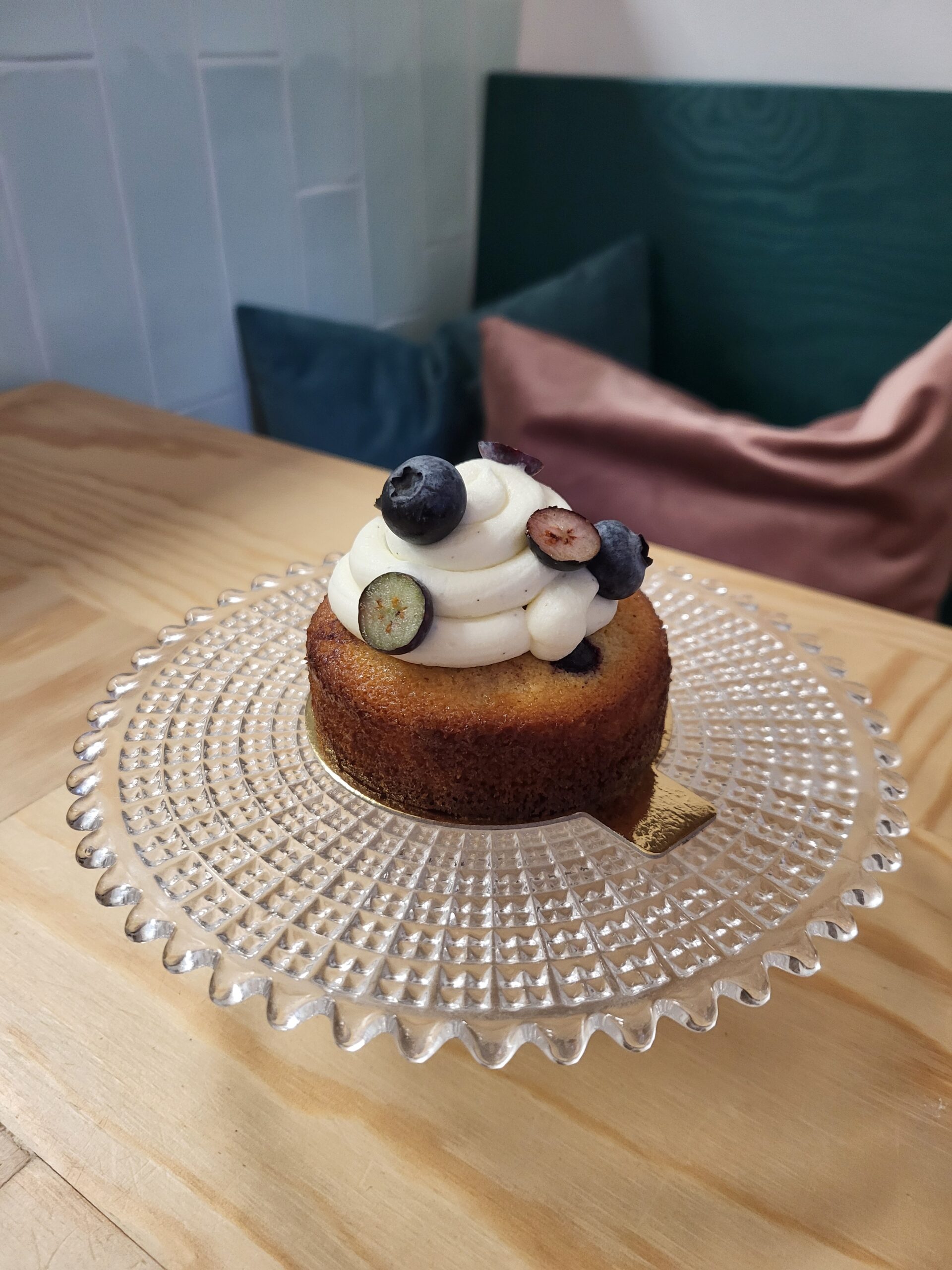 Een tijdelijke wissel met ons amandel peer gebakje, deze amandelcake met meegebakken blauwe bessen is op smaak gebracht met kardemom, bovenop een mandarijnen gelei en afgetopt met vanille mascarpone room.